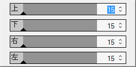 ポップアップのアドバンス サイズ コントロールが表示されます。スライダを使用する、上下の矢印キーを使用する、数値を直接入力する、のいずれかの方法で、枠の各サイドの幅を個別に設定します。著作権情報を入力するスペースが必要なため、枠の下幅を大きく設定したい場合、などが例として挙げられます。[サイズ] スライダの横にある矢印をクリックすると、アドバンス コントロール メニューが開かれます。 |