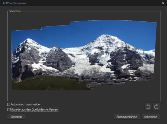 Sobald das Panorama-Vorschaubild erstellt ist, können Sie die Funktion „Automatisch zuschneiden“ oder „Vignette entfernen“ anwenden: