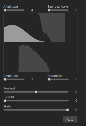 Verstärkt die Intensität der Aufhellung aller Bildbereiche. Die Kurve erhöht sich. Nach links: Verringert die Intensität der Aufhellung und die Höhe der Kurve. Steht der Regler "Ausschlag" auf 0, wird das Bild nicht aufgehellt. Bei einem Ausschlagwert von 100 - 200 erhöht sich der Grad der Beschneidung proportional. In den meisten Fällen ist es nicht notwendig, den Ausschlag zu ändern. |