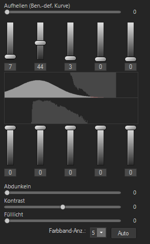 - Ziehen Sie die Regler für die Aufhellung oder Abdunkelung, um die hellen oder dunklen Farbbänder anzupassen. Dabei erscheint eine graue Kurve, die Ihre Korrekturen anzeigt.