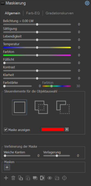 Um eine weitere Maske anzuwenden (es stehen bis zu 24 zur Verfügung), klicken Sie auf das + unten links im Bedienfeld und wählen eine Maskierungsoption aus. Im Bereich "Masken" wird ein neues Symbol angezeigt, das dem ausgewählten Maskentyp entspricht. Die aktuell ausgewählte Maske wird blau umrandet. Sie können jede der Masken jederzeit wieder auswählen, indem Sie auf das entsprechende Symbol klicken.