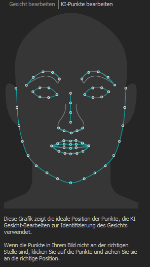 Die KI erkennt Punkte auf einem Gesicht, um Gesichtsmerkmale im Bild zu identifizieren. Diese Punkte befinden sich möglicherweise nicht an der richtigen Position. Klicken Sie auf die Registerkarte KI-Punkte bearbeiten, um dies zu korrigieren. Auf dieser Registerkarte wird eine Grafik mit den idealen Positionen für die Punkte angezeigt. Folgen Sie der Grafik, um durch manuelles Klicken und Ziehen die Punkte an die ideale Position zu bringen.
