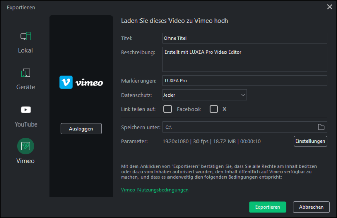 - Klicken Sie auf die Schaltfläche Exportieren, um das Video auf Vimeo hochzuladen.