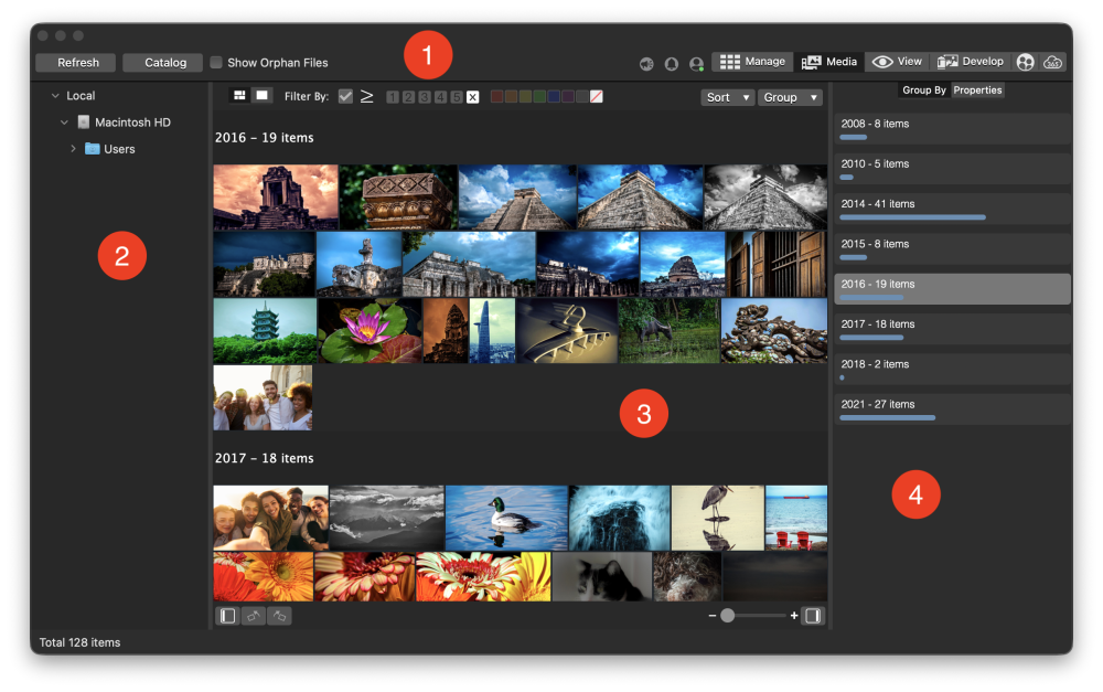 Media mode offers a streamlined, database-driven approach to Digital Asset Management. Only the folders browsed in Manage mode and that have been cataloged into the ACDSee database will be displayed in Media mode, offering a clutter-free view of photographs and videos managed by ACDSee.
