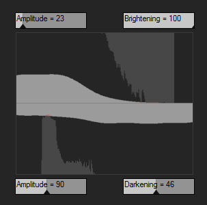 Two colored curves appear and change as you drag the Brightening, Darkening and Amplitude sliders — these curves indicate the amount of brightening and darkening applied throughout the tonal range of the image. Darker tonal areas are on the left, and brighter tonal areas are on the right. As you move your cursor over the image, a vertical line in the graph indicates the tone level of the area under the cursor within the tonal range. At times there are two lines because the tone levels for brightening and darkening are not necessarily the same. This is because brightening is sensitive to maximum color values while darkening is sensitive to minimum color values.