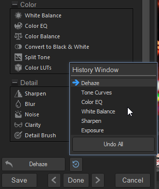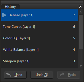 You can use the Edit mode History Window to view the sequence of changes you have made to your image. You can also use the History Window to jump around in your editing sequence and revert back to a previously-applied adjustment. For example, if you applied a series of adjustments, such as color adjustments, followed by sharpening, and exposure tweaking, but you want to revert back several steps to the state your photo was in with just the color adjustment, you would use the Edit mode History Window.