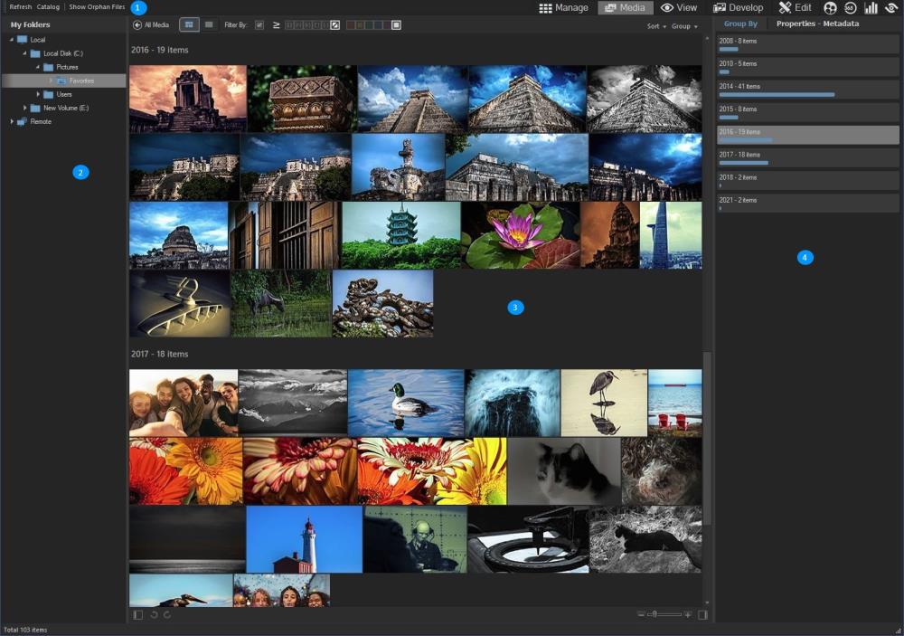Media mode offers a streamlined, database-driven approach to Digital Asset Management. Only the folders browsed in Manage mode and that have been cataloged into the ACDSee database will be displayed in Media mode, offering a clutter-free view of photographs and videos managed by ACDSee.