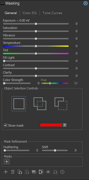 To apply another mask, (up to 24 are available), click the + on the bottom left of the panel and select a masking option. A new icon (related to the type of mask selected) will appear in the Masks section. Your currently selected mask will be outlined in blue. You can reselect any of the masks at any given time by clicking its respective icon.