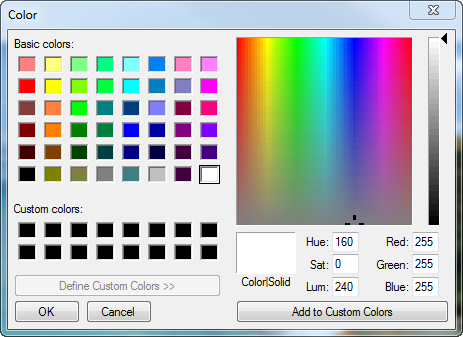 To select a color, click on a square in either grid, or on the color palette. You can also drag over the color palette. When you click a color, or lift your finger off the mouse after dragging, that color appears in the large Color/Solid square and all its numerical values; Hue, Saturation, Luminosity, as well as Red, Green, Blue, appear in the boxes.