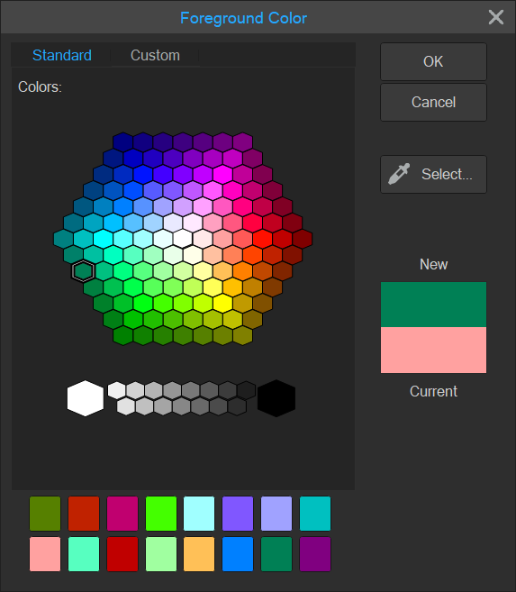 On the first tab, there is a fixed honeycomb of Basic colors to choose from, including gray, black, and white at the bottom. Below it is a grid of Custom or Favorite colors that you can fill in by selecting a color and then right-clicking a box in the grid. To create a custom color, click the Custom tab.