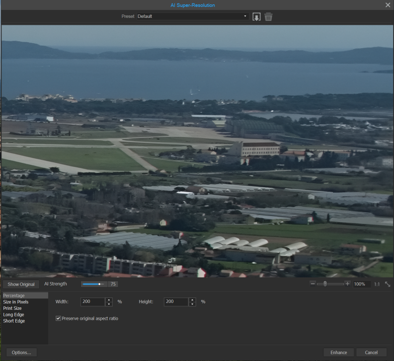 - Click Enhance to apply Super Resolution to your image. The enhanced image will be saved by default into the same folder as the original. You can adjust this setting within Options at the bottom of the AI Super-Resolution dialog.