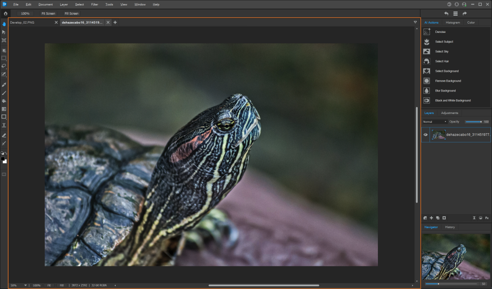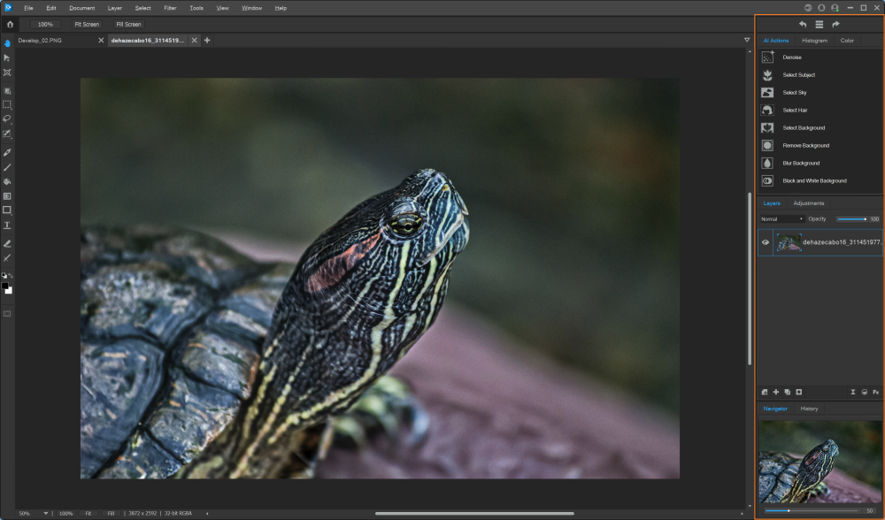 The Histogram/Color pane, the Layers/Adjustments pane, and the Navigator and History pane can all be docked and undocked from the Editing Pane.