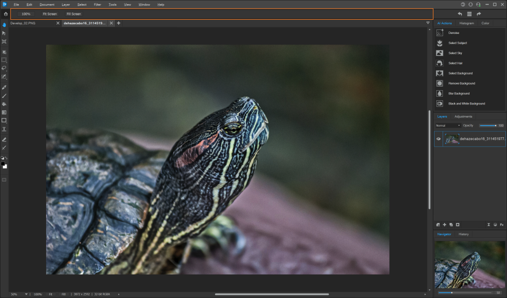 The Navigator tab displays the zoomed portion of the image in relation to the entire original image. If the image is not zoomed, only the original image appears in the Navigator tab. If the image is zoomed, a marquee highlights the zoomed portion.
