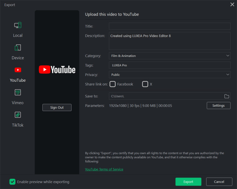 - Click the Export button to upload the video to YouTube.
