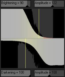 Two colored curves appear and change as you drag the Brightening, Darkening and Amplitude sliders — these curves indicate the amount of brightening and darkening applied throughout the tonal range of the image. Darker tonal areas are on the left, and brighter tonal areas are on the right. As you move your cursor over the image, a vertical line in the graph indicates the tone level of the area under the cursor within the tonal range. At times there are two lines because the tone levels for brightening and darkening are not necessarily the same. This is because brightening is sensitive to maximum color values while darkening is sensitive to minimum color values.