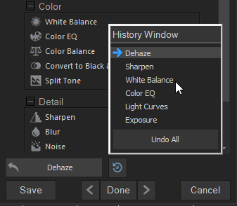 You can use the Edit mode History Window to view the sequence of changes you have made to your image. You can also use the History Window to jump around in your editing sequence and revert back to a previously-applied adjustment. For example, if you applied a series of adjustments, such as color adjustments, followed by sharpening, and exposure tweaking, but you want to revert back several steps to the state your photo was in with just the color adjustment, you would use the Edit mode History Window.