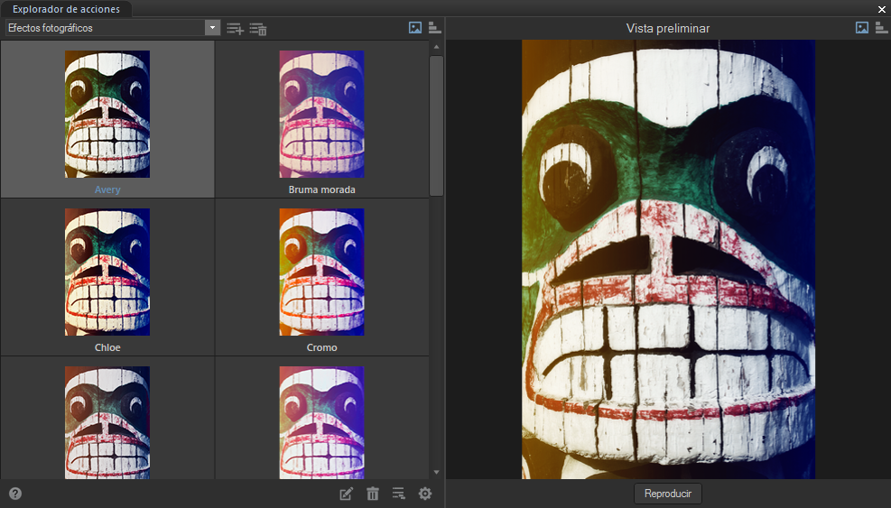 You can also apply pre-loaded default actions for quick adjustments. Actions can be organized into existing categories, or you can create your own. You can delete categories, as desired.