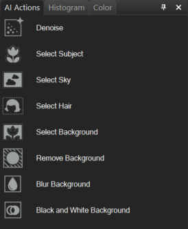 In addition to the AI Actions pane, Select Subject, Select Sky, Select Hair, and Select Background can be accessed via the Select menu.