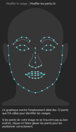 L’IA détecte 72 points sur un visage pour identifier les traits du visage dans l’image. Il se peut que ces points ne soient pas correctement positionnés. Pour y remédier, cliquez sur l’onglet Éditer les points IA. Cet onglet présente un graphique indiquant l’emplacement idéal des points. Suivez le graphique pour cliquer et faire glisser manuellement les points afin de les ajuster aux emplacements idéaux.