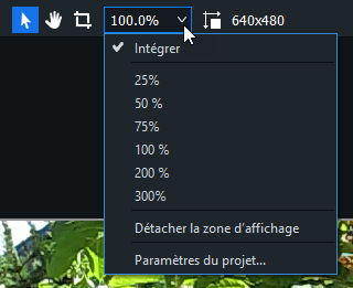 Vous pouvez zoomer sur la zone d’affichage pour l’adapter à la taille de votre moniteur en utilisant les pourcentages du menu déroulant situé en haut de la zone d’affichage. Choisissez Intégrer pour permettre à Luxea de s’adapter automatiquement. Vous pouvez également détacher la zone d’affichage pour faciliter l’édition. Cette fonction est utile si vous effectuez des montages sur deux écrans ou si vous souhaitez visualiser vos montages en plein écran.