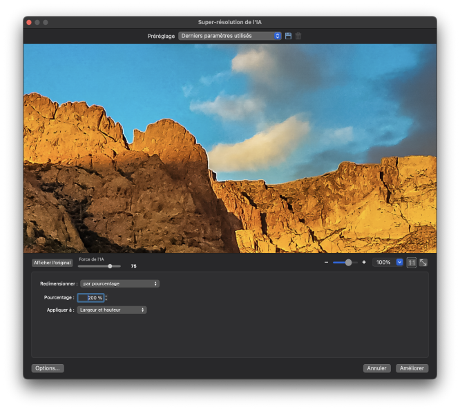 Le pourcentage est fixé par défaut à 200 %, mais peut être ajusté à votre convenance jusqu'à un maximum de 400 %. Le menu déroulant Appliquer à : vous permet de choisir les dimensions concernées par la Super-résolution de l'IA, notamment la largeur, la hauteur ou la largeur et la hauteur. |