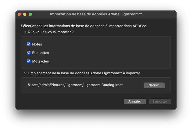 Vous pouvez utiliser l'importateur de base de données Adobe® Lightroom® pour importer vos collections, mots-clés, classements et étiquettes de couleur de Lightroom® dans ACDSee. Vos hiérarchies de mots-clés seront importées indépendamment du fait qu'elles soient intégrées ou non aux images sélectionnées pour l'importation.