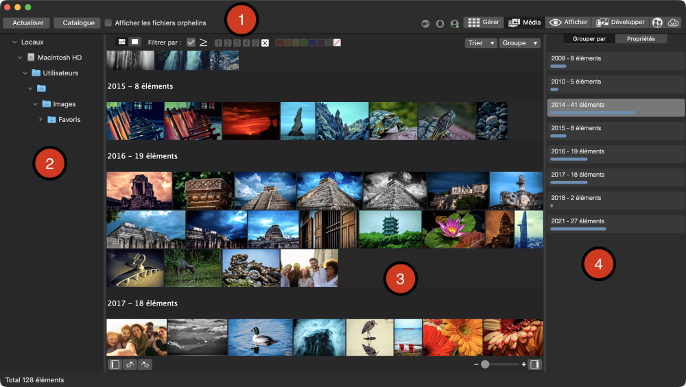 Le volet Zone d’affichage occupe la partie centrale de l’écran et est principalement utilisé pour afficher les images et vidéos qui peuvent être filtrées, triées ou regroupées.