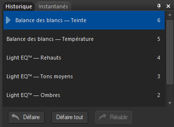 Utiliser le bouton Défaire pour annuler les modifications curseur par curseur, ajustement par ajustement. Utilisez le bouton Rétablir pour rétablir les options que vous aviez définies avant de cliquer sur Défaire. |