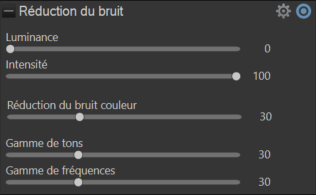 Pour enregistrer de nouvelles valeurs par défaut ou pour réinitialiser les valeurs par défaut de l’outil de Réduction de bruit, cliquez sur l’icône des paramètres