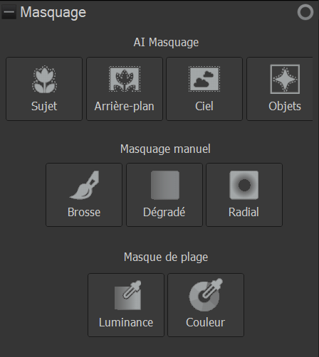 La barre d'outils de masquage se trouve en bas du groupe Masquage. Il s'agit notamment d'options pour :