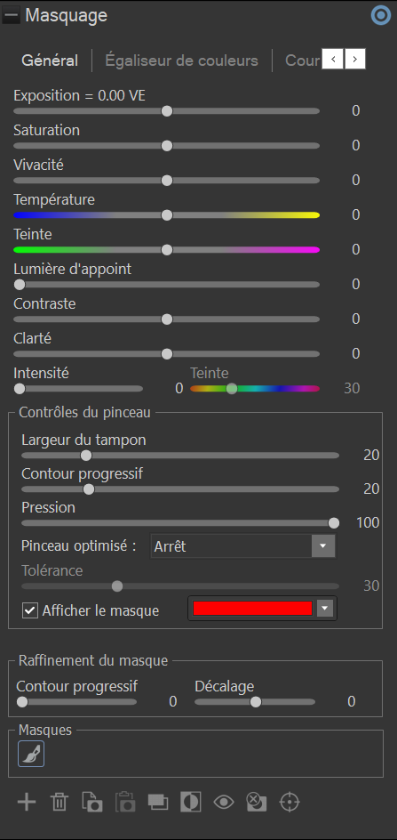 Les commandes de la brosse de développement peuvent être ajustées une fois que vous avez commencé à appliquer un masque. Les options apparaissent au bas du groupe Masquage et comprennent :