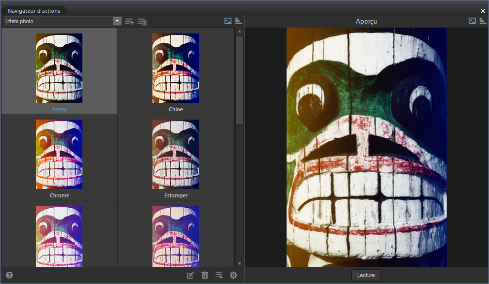 Vous pouvez appliquer vos enregistrements à d'autres images pour une édition par lots avec les ajustements du mode Éditer que vous avez enregistrés. Vous pouvez également appliquer les actions préchargées par défaut de votre choix, qui sont classées dans des catégories dans le navigateur d'actions.
