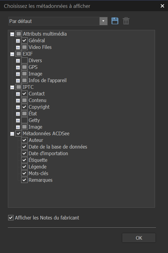 - Cliquez sur les signes plus + pour développer l'arborescence, puis cochez ou décochez les préférences à inclure. Voir la section Paramètres de gestion de l’affichage de métadonnées, ci-dessous.