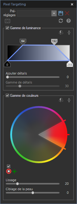 Les champs Plage de couleurs sont utilisés pour cibler certaines couleurs. Cochez la case Plage de couleurs pour accéder aux fonctionnalités associées.