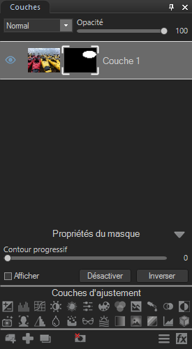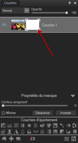 Sélectionnez le masque de couche qui vous intéresse dans le volet Couches, choisissez l'ajustement qu'il vous faut ou l'outil de dessin ou de sélection.