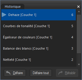Vous pouvez utiliser la fenêtre Historique du mode Éditer pour afficher la succession de changements apportés à une image. Cette fenêtre permet également de parcourir l’ensemble de vos modifications et de revenir à une version précédente. Par exemple, si vous avez appliqué une série de modifications, comme des réglages de couleurs, suivis de l’amélioration de la netteté, puis des retouches d’exposition, mais que vous souhaitez revenir à une étape précédente, où seuls les réglages de couleurs avaient été appliqués à la photo, vous aurez recours à la fenêtre Historique du mode Éditer.
