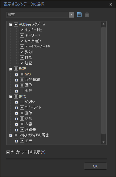 [メーカーノートを表示] チェックボックスをオンまたはオフにすることで、メーカーノートを表示するかどうかを選択できます。