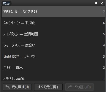 履歴ペインを使用して、画像に施した一連の変更を表示することができます。履歴ペインを使用すれば、編集履歴の任意の変更を選択して、画像をその変更が適用される前の状態に戻すことができます。例えば、カラーの調整をした後シャープネスを編集し、次に露出を調整するなど複数の調整を連続して適用した場合に、いくつかの編集を遡ってカラー調整だけした状態の画像に戻したいときなどは、編集モードの履歴ペインを使うことができます。