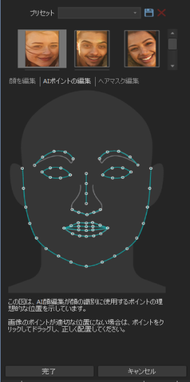 AIは顔のポイントを検出し、画像内の顔の特徴を特定します。これらのポイントは、正しい位置にない場合があります。これを修正するには、[AIポイントの編集] タブをクリックします。このタブには、ポイントの理想的な位置を示すグラフィックが表示されます。グラフィックに従い、手動でクリックしてドラッグし、ポイントを理想的な位置に調整します。
