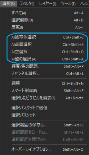 [選択] | [AI髪の選択] をクリックするか、Ctrl + Shift + A キーを押します。