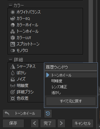 特定の調整に戻すには、編集モードパネルの下方にある履歴ウィンドウの矢印を選択して、戻したい調整を選択してダブルクリックします。リストにある調整はどれでも選択することができますし、すべて元に戻すを選択して行った調整を、すべてを一度に元に戻すこともできます。