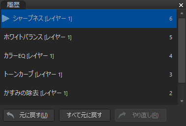 編集モードにある履歴ウィンドウで、画像に行った一連の変更を表示して確認することができます。履歴ペインを使用すれば、編集履歴の任意の変更を選択して、画像をその変更が適用される前の状態に戻すことができます。例えば、カラーの調整をした後シャープネスを編集し、次に露出を調整するなど複数の調整を連続して適用した場合に、いくつかの編集を遡ってカラー調整だけした状態の画像に戻したいときなどは、編集モードの履歴ウィンドウを使うことができます。