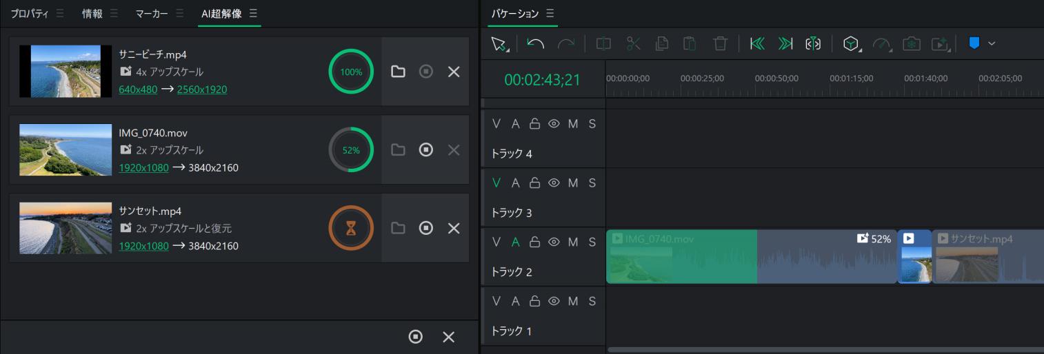 The progress of any upscaling asset can also be viewed on the Timeline if the clip has been placed. A percentage will display on the right-side of the clip, and a progress bar will fill across the clip itself on the Timeline.