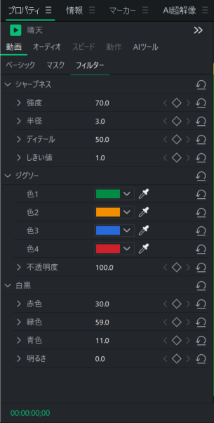 - By selecting the filter effect on a clip on the Timeline, its properties are loaded into the Properties Panel. Here you can adjust elements unique to each Filter.