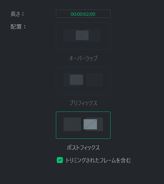 - Postfix: Postfix will place the transition directly after the first clip, displaying more of the second clip during the transition, and none of the first.