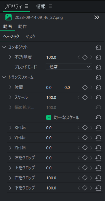 Transform contains a standard suite of properties to adjust such as position, scale, scale width, rotation on X, Y, or Z axes, and cropping on any side. |