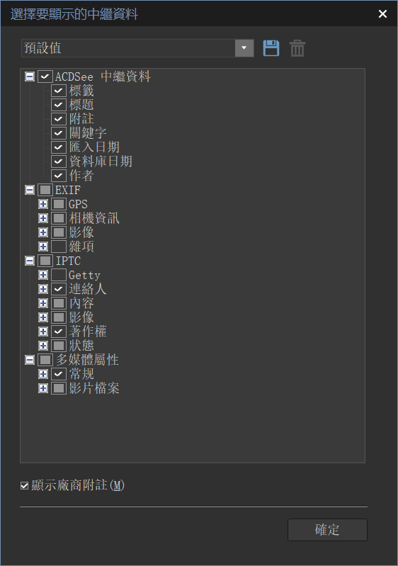 - 按一下加號 + 以展開樹狀目錄,並勾選/取消勾選核取方塊來選擇喜好設定。請參閱下面的「管理中繼資料視圖」選項。