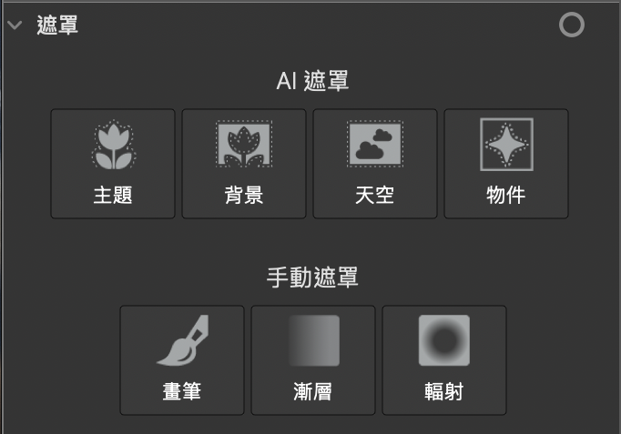 您可以使用單擊 AI 選項之一來遮罩主題、背景或天空,進行局部調整。您也可以使用筆刷、線性和徑向漸層遮罩進行更精細的手動調整。