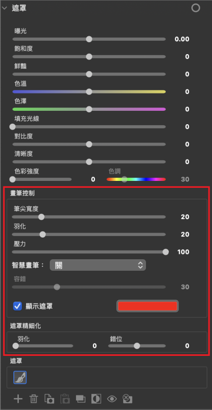 一旦開始套用遮罩,就可以調整「沖印筆刷」控制,如需詳細資訊,請參閱 「沖印筆刷」。也可以透過羽化或移動遮罩來精細化遮罩。
