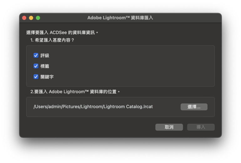 您可以使用 Adobe® Lightroom® 資料庫匯入器,將您的收藏、關鍵字、評級和顏色標籤從 Lightroom® 匯入 ACDSee。您的關鍵字階層結構將會匯入,與它們是否內嵌於選定要匯入的影像中無關。